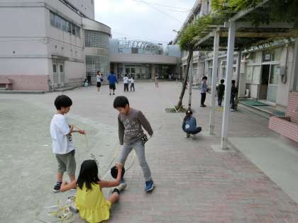 午後の犬走り、巻き尺を手にした3年生で大賑わいです。m単位のながーい長さを測定していました。