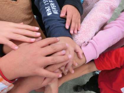 「鬼ごっこする人、この指とまれ」が、なぜかこんな具合に集まって始まった、2年生のロング昼休みです。