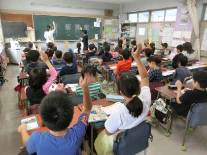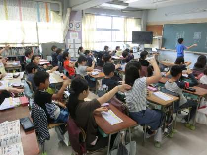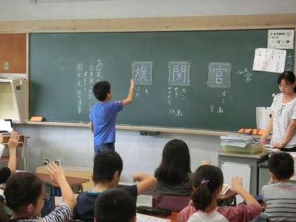おや、前に立っているのは、担任の先生ではなく4年生ではないですか。音訓の読み方や書き順等、子どもだって立派に先生役を務めてしまいます。時に、このようなミニ先生が登場することで、逆に意欲や意識が高まる効果があるのです。変化球を織り交ぜながら、授業がすすんでいきます。
