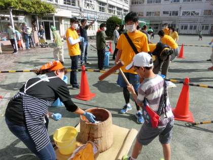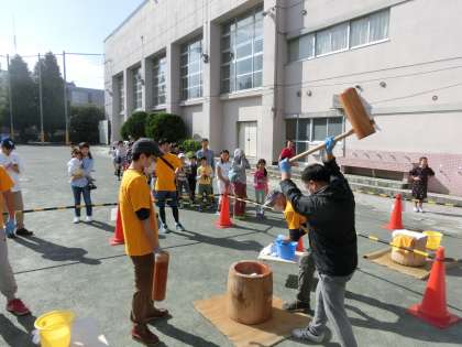 餅つきに挑戦する就学前の弟や妹さんに、優しく寄り添ってお世話してあげている姿は、なんとも微笑ましかったです。
