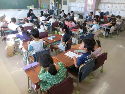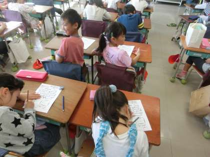 マラソンタイムは初体験の1年生が、教室に戻り、個人の記録カードに走った分だけマスに色塗りをしたり、今後のめあてを記入したりしていました。
