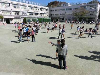 中休みは偶数学年の出番です。朝より設定時間が長い分、10周超えも夢ではありません。全力で走れば、びっしょりの汗です。
