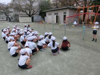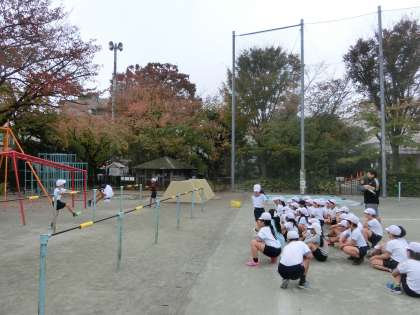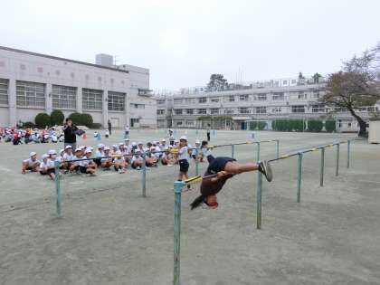 逆上がりと足掛け上がりのテストをしている3年生です。誰もが軽々とできる技ではありません。惜しい! あと一歩! というような場面で、見守っているみんなから自然発生的に、励ましの声があがります。とても温かい空気です。チャレンジャーにとっては心強いことでしょう。
