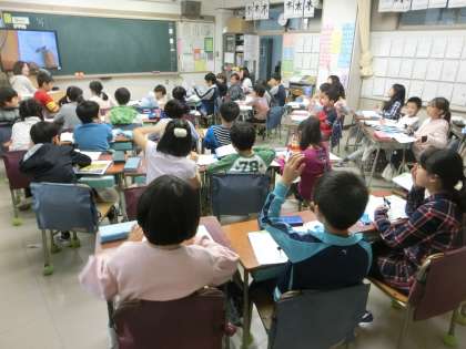 先生は実物投影機も活用して、そのノウハウを披露。子どもたちにとっては視覚的にとらえやすく、理解や習熟を助けます。