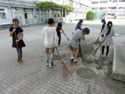 雨水によって建物の脇に溜まった砂を、犬走り清掃担当の4年生が必死に除去を始めていました。指示された訳ではなく、それに着眼しての自主的な行動です。