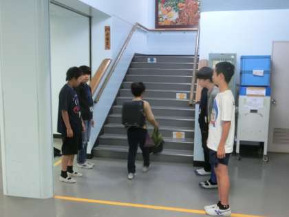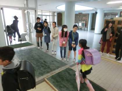いつもなら正門と南門に立つ当番のみんなが、今朝は昇降口付近でお出迎えです。ズラリと並んだ6年生の数に圧倒され、照れくさそうにしている子もいました。読み聞かせで来校された親御さん方にも「おはようございます」と、元気よく。