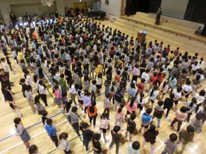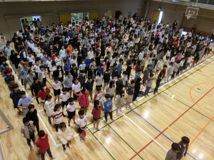 体育館におよそ850人の全校児童が集まります。無秩序におしゃべりが始まったら、大変な事態となるでしょう。けれども、松丘小ではそんな心配はなし。週番の先生が舞台に立つと、いつも通り潮が引くように私語が消えていき、みんなの耳と目と心が一点に集中します。
