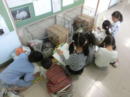 国語単元「みのまわりのいきもの」を学習中の1年生が、オセロとブランのゲージを取り囲んでいます。よく観察して、メモを取ろうと張り切っているのですが、肝心の2羽が雲隠れしたままで、姿を現してくれません。ウーム、これは困った。