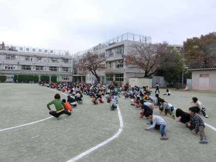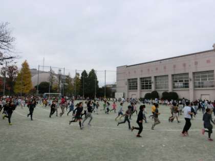屋外で活動している者は、全く気付かないレベルの揺れ(世田谷区は震度2)が、走り終わって整理運動というタイミングで起こりました。校内放送によって知った訳です。校庭にいたみんなは、すぐに低い姿勢を取り、普段の訓練を生かした動きを取ることができました。特に3年生、5年生はほとんど私語もなく、立派でした。