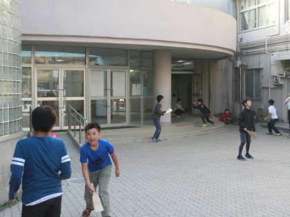 職員室外の犬走りから、コンコンカンカン音が聞こえて来ます。気になって出てみたら、そこにいたのは羽根つきクラブではなく、その名も「昔遊びクラブ」のメンバーたちでした。優雅に正月遊びと言う風情よりは、バドミントンやテニスをやっているような空気が漂っているように感じられたのは、ただの気のせいなのでしょうか。