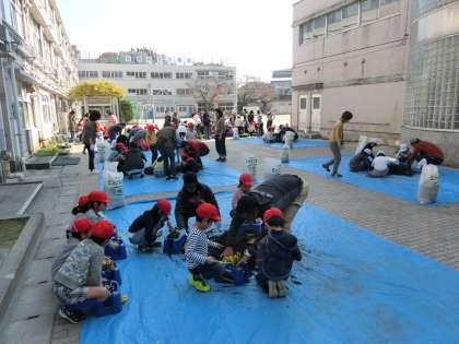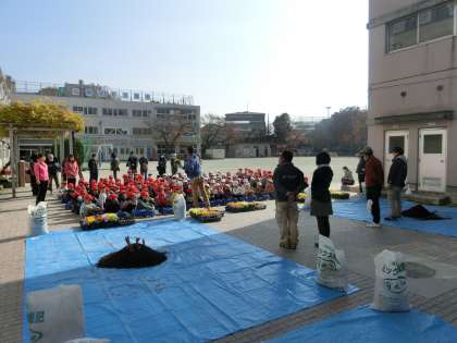 3校時は2年生の番です。同じ内容の作業に、一年前は悪戦苦闘の末、一時間を要したという現2年生が、成長ぶりを発揮する時がやって来ました。今回は手際よく進むでしょうか。但し、お花は前回と異なり、ビオラとスイセンを育てていくことになります。