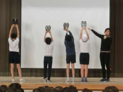 朝会の締めは週番からの生活目標のお話が定例です。けれども、今朝はそこにも児童が登場しました。「あそべくつ」の「くつ揃え」について、NG例と正しい見本を示範する役として。