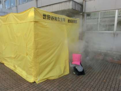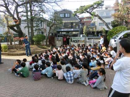 奇数学年児童は、煙ハウス内の歩行による煙体験も行いました。特に、1年生にとってはおそらく初体験だったはず。「怖い」「何も見えなくて大変」と感じてくれたら大成功ですが、「面白かった」「もっとやりたい」といった具合だったら、今後が心配です。帰宅したお子さんに、さり気なく聞いてみてはいかがでしょう。