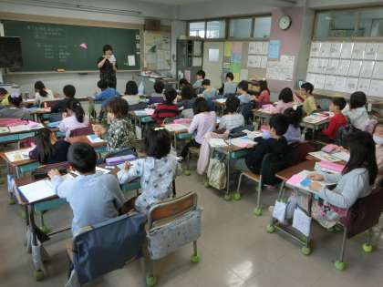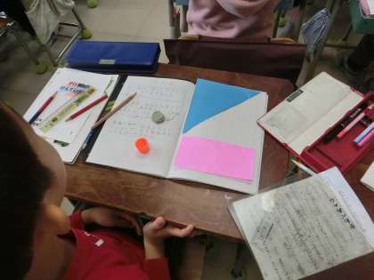 2年生算数は分数単元に入りました。折り紙を同じ大きさに二等分する方法を、実物を用いて考える授業でした。実体験を通して、低学年の子どもたちはその概念を理解していきます。