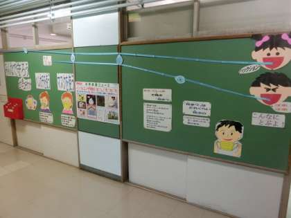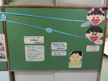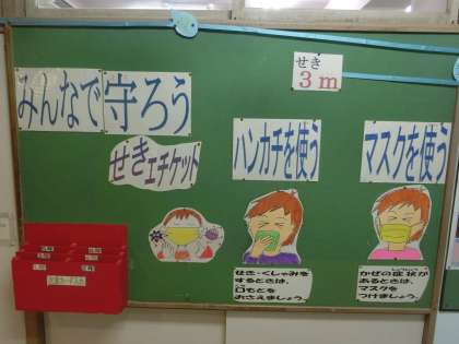 保健室前に昨日、こんな掲示が登場。飛沫感染の凄さ、怖さを視覚的に捉えさせ、せきエチケットの定着を図るために講じた手立てです。これなら低学年の子も、目で見て分かりやすいですね。