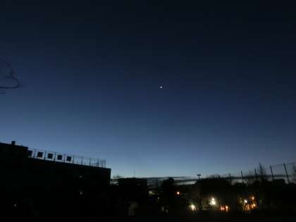 午前5時、満天の星空。午前6時、蒼い東の空。よく晴れたため、予報以上に冷え込み、松丘では0度台に。寒い朝ですが、あいさつ運動、マラソンが控えています。