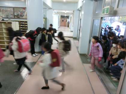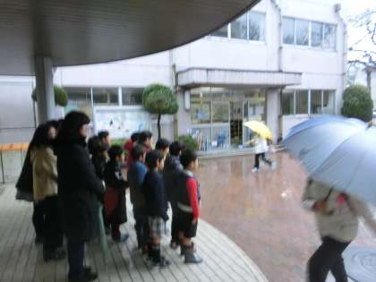 こんな雨降りに、傘を持たずに濡れて登校する低学年の姿あり。なぜでしょう。心配。
