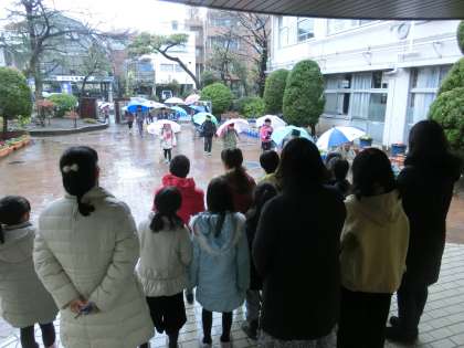 あいさつ運動も雨ヴァージョンで