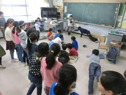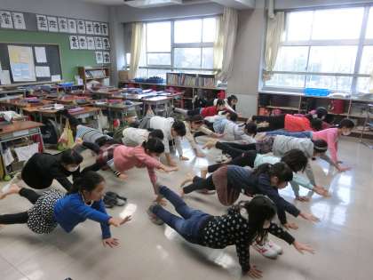 せっかくの校庭体育が気の毒に中止となってしまったクラスは、担任の先生が打開策を練ります。そして、教室を使い、日頃から継続して取り組んでいる体つくりの運動を実行! 狭いスペースながら、子どもたちはいきいきと活動していました。友達のがんばりを認め、拍手をおくる様子も好印象でした。
