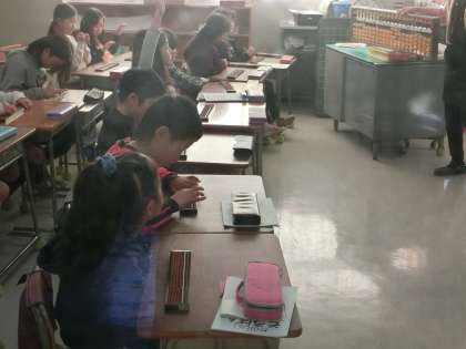 21世紀の小学校教育においても、そろばん指導は健在です。4年生が取り組んでいました。