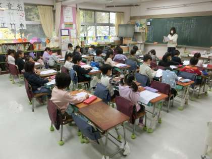 席順に問題と解答を言いながら、自分自身で丸付けをすることは、どの学校でも全学年で行われている定番の方法です。最初の頃は要領を得なかった1年生も、今ではすっかり板につき、整然と答え合わせが進行していました。
