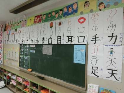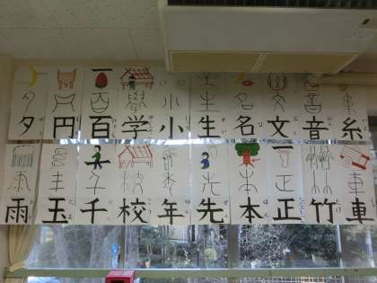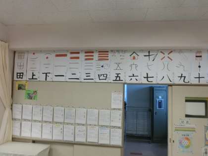 ある教室の3方向の壁には、たくさんの漢字(成り立ちの解説付き)カードが並んでいました。こんなに多くの漢字を学習してきた、今までの足跡が残されているのですね。残っているのはカードだけでなく、一人ひとりの頭の中にも数多くの漢字が刻み込まれていることと信じます。伸び盛りの1年生です。