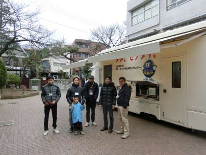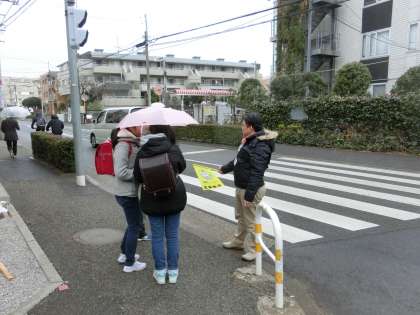この寒さに、さすがにいつものユニフォームは非着用ということでしたが、熱い思いに変わりはなく、旗を手に子どもたちの下校路を見守ってくださいました。