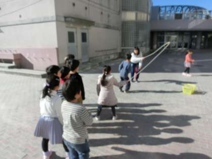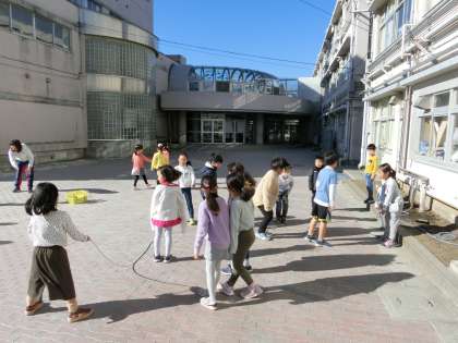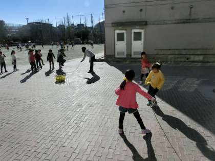 歌いながら、1年生が長縄跳びの習熟を図っています。元気な歌声につられ、跳ぶ子もリズムにのって、テンポよく跳べるようになるとよいですね。