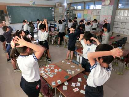 単なるお遊びのカルタではなく、国語的・教科日本語的な要素が読み札に詰まったカルタ取りをしています。2年生がゲーム的活動を楽しみながら、本質を理解していくという流れです。