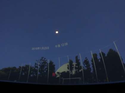この3枚の画像、一日前にアップした夜明け前のショットにちょっぴり似ている気が。けれども、撮影場所はプラネタリウム内です。松丘小の校庭から空を見上げた想定で、太陽や月の動きに関する説明が行われています。なかなかリアルでしょ。