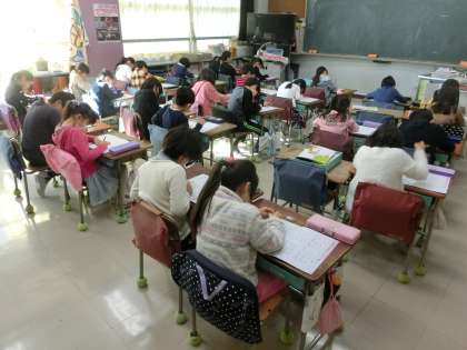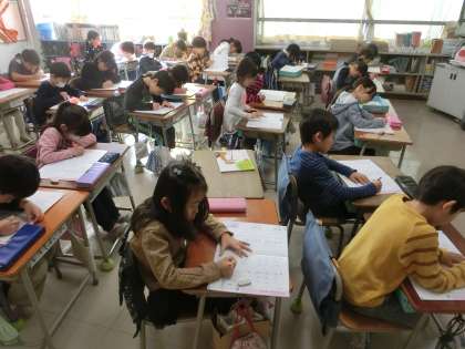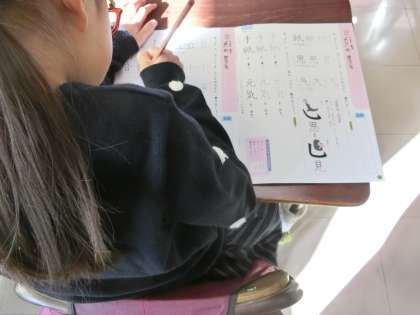 2年生が硬筆による書き方のお勉強をがんばっています。「書写ノート」に丁寧に一文字、一文字を書き記していました。