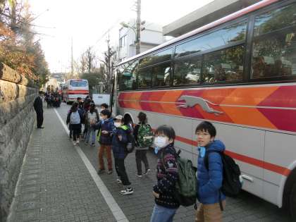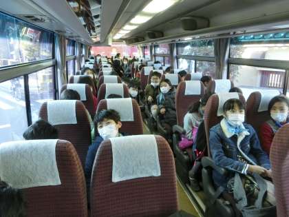 4学級が3台のバスに分乗意して出発です。先生方のお見送りに、手を振って応えるみんなです。