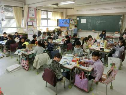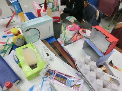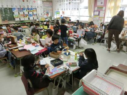1年生が夢をふくらませ、持ち寄った空き箱をおうちに変身させています。