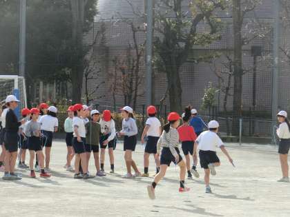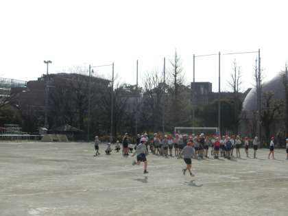 重点を置いている短なわとび指導を生かし、今日は駆け足なわとびリレーを行っています。4年生が曲がりくねったコースを、えっちらおっちら、もとい、快調な足取りで、透明なバトンをつないでいました。おおいに盛り上がった体育でした。