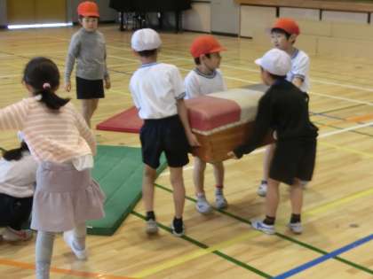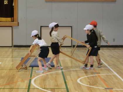 跳び箱を運ぶ1年生、そこでは「自分のやるべき勉強や仕事をしっかりと行うこと」(希望と勇気、努力と強い意志)、「友達と仲よくし、助け合うこと」(友情、信頼)といった内容項目の要素が発揮される場となっています。日常に生かしている姿、とてもすてきです。