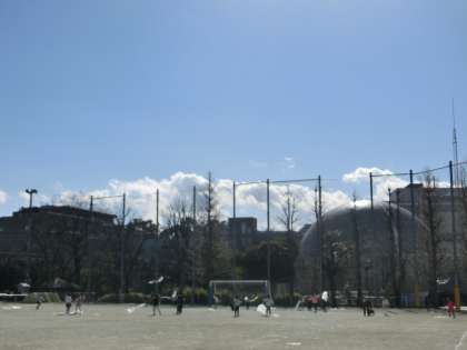 未明の一雨はもはや幻、早くも校庭では砂嵐が巻き起こっています。あったかい春の風がビュービューです。