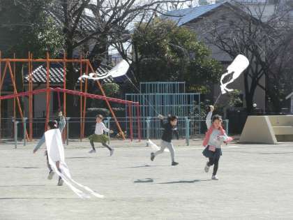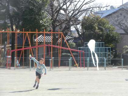 そんなコンディションを唯一喜んでいるのが、凧あげの1年生です。いつもなら迷惑な強風が、今日ばかりは凧あげのお助けマンになってくれています。でも、あまり要領を得ていないらしく、今日もひたすら走り回っている子が大多数。立ち止まったままでも、空高くあがるのはずなのになぁ。