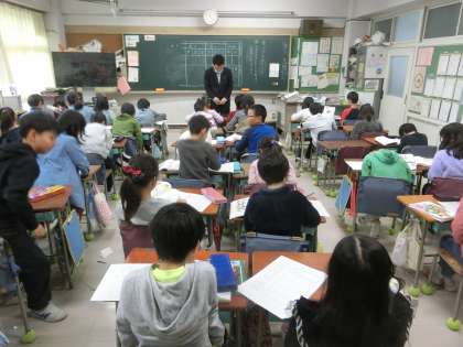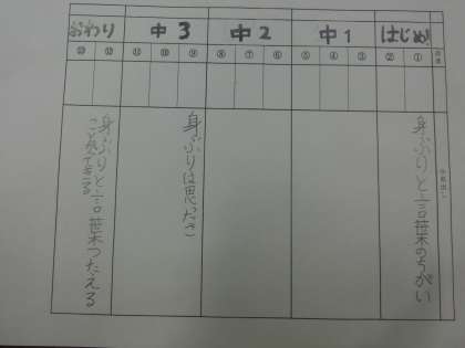 3年生は教材文の小段落毎に、小見出しを付ける学習を行っていました。同じ国語科でも各学年の授業を見て回ると、発達段階に応じた学習内容の違いが手に取るように分かって、興味深いものです。