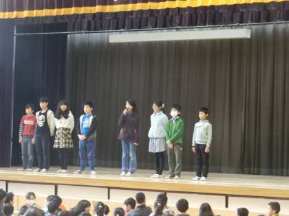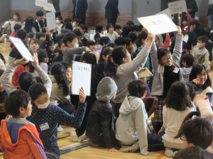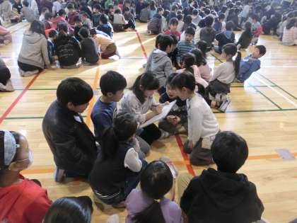 集会委員によるクイズ集会でした。舞台上で再現された、運動会、音楽朝会、松丘まつりの様子を見て、班毎に相談し、ホワイトボードに解答を書いていきました。異学年交流のひとときです。