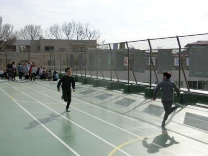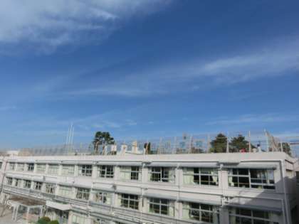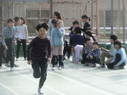 3階の廊下を巡視をしていたら、何やら上の方から気配が。そして、子どもたちの元気な声と人影を発見。どうやら屋上で活動しているようです。興味津々、上がってみたら、繰り広げられていたのはリレーでした。格段、特別な光景ではないものの、そのエネルギッシュな様子に、活気みなぎる一日の予感です。