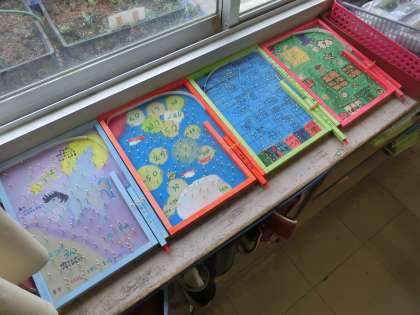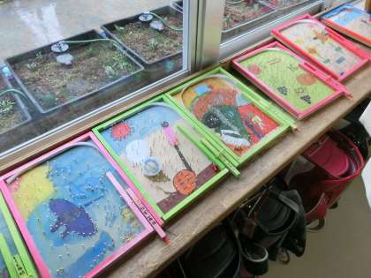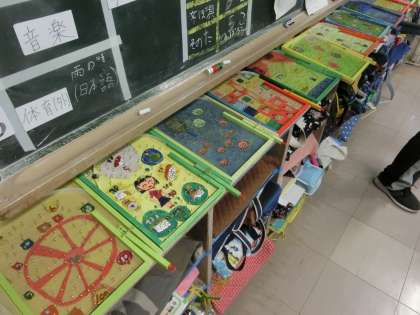 先週、制作の様子をお届けした3年生の図工作品が仕上がり、教室内に展示されていました。カラフルで、見るからに面白そうな力作群です。