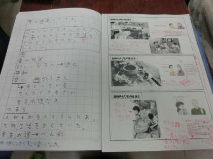輝ける知的好奇心に裏打ちされた探究心を働かせなつつ、おじいさんやおばあさんが子どもの頃(戦後の昭和)の暮らしぶりについて、いきいきと追究している3年生です。一人ひとりが思考を巡らせたり、グループで交流を通して考えを深めたりしながら、学習のめあてに迫っていきました。ノート記述も充実しています。