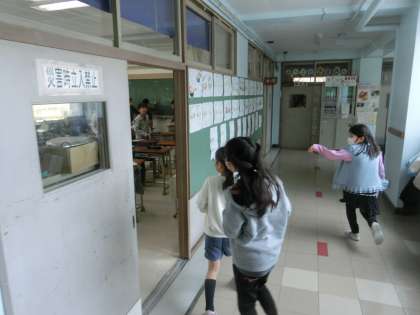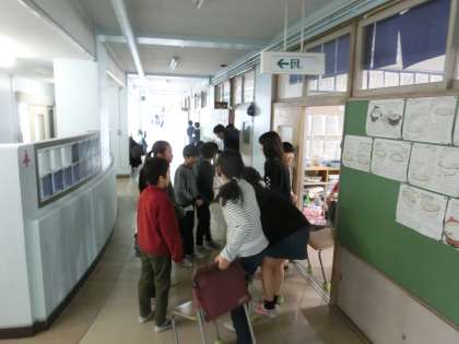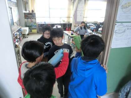 全体会の第一部が終わり、第二部は各教室に6年生をお招きしての交流給食です。準備が出来たクラスの子たちが、お迎えに出かけています。ご案内する側も、招待される側も、とても楽しげでした。