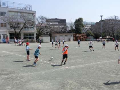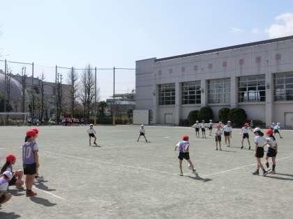 体育単元「ベースボール型ゲーム」として、3年生がキックベースで盛り上がっています。1組・3組が合同の時間を活用し、クラス対抗形式で勝負が繰り広げられていました。ポカポカと暖かく、打順の待ち時間も苦になりません。