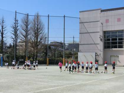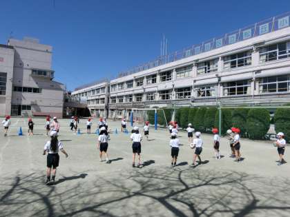 ボールけりに夢中の1年生です。活動の合間に、先生からの指示が入ります。そんなとき、パッと気持ちを切り換えて、お話に傾聴できるみんなは、もう2年生の風格です。聞き名人が増えていますね。