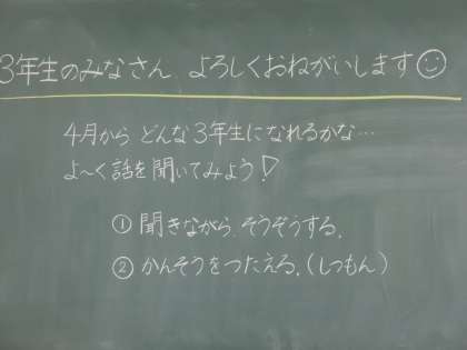 現3年生が新3年生へ向け、楽しみに、不安なく進級できるようにと、3年生の生活について教えにやって来てくれました。「説明会」なんてネーミングしてしまうと、どこか堅苦しい感じになってしまいますが、要は異学年交流の位置付けです。ほぼマンツーマンで、先輩が後輩へと懇切丁寧にアドバイスや励ましを届けてくれたのではないかと思います。