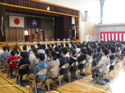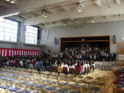 卒業生、5年生、教員が集合し、本番さながらの予行です。