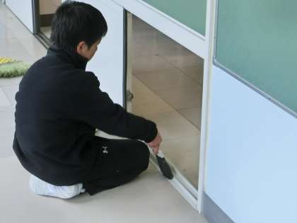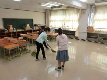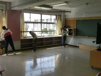 日頃から「あそべくつ」を磨いてきた6年生だからこそ、掃除は余裕です。机と椅子の搬出入が終わった教室の鑑賞整備に取り掛かっています。