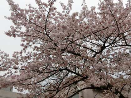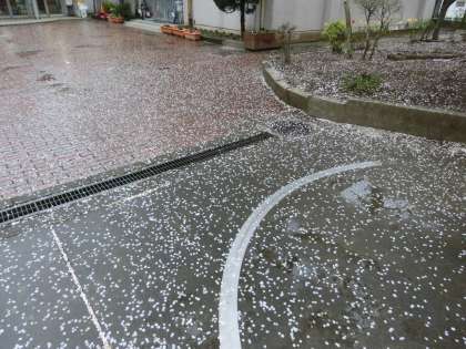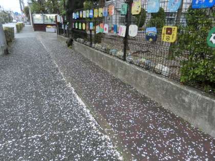 今朝は、正門前の桜が散り始め、淡いピンク色のじゅうたんになっていました。
