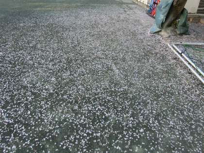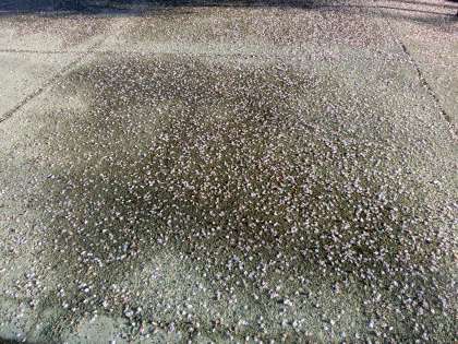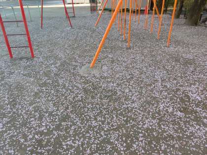 4月の校庭に桃色の新雪?! 昨日の雨で一段と散り敷いていました。